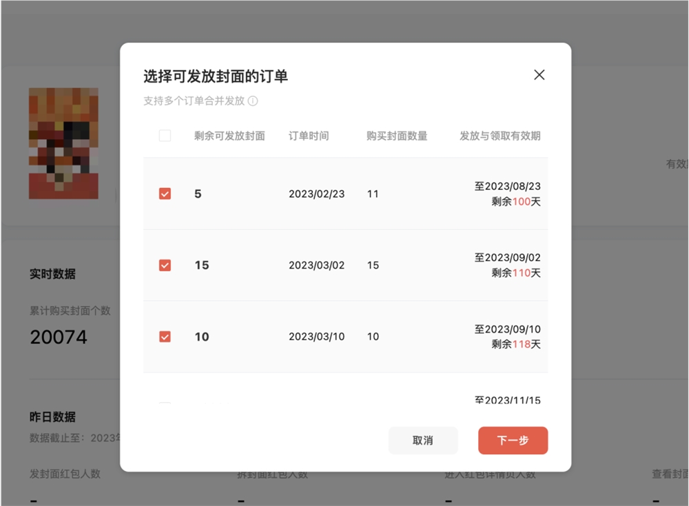 3. 勾选需要合并发放的多笔订单,点击【下一步】。