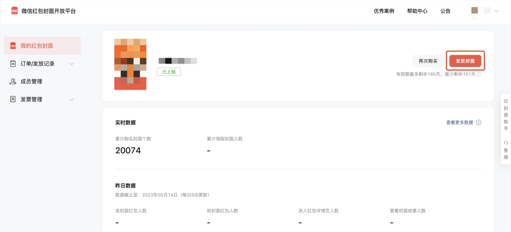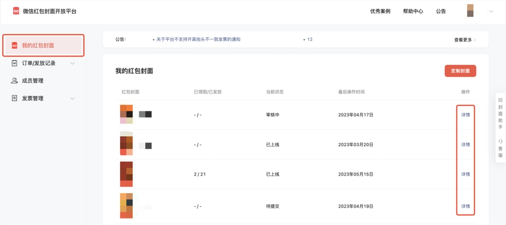 1.在电脑端登录微信红包封面开放平台(cover.weixin.qq.com),进入【我的红包封面】,选择一款需要合并发放的封面,点击【详情】。