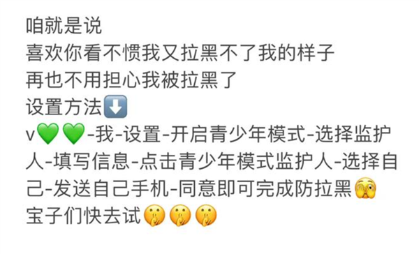 对此,网友开发出了新的玩法,偷偷将对方微信账号设置为被自己监护的青少年模式,对方就不能将自己拉黑了。