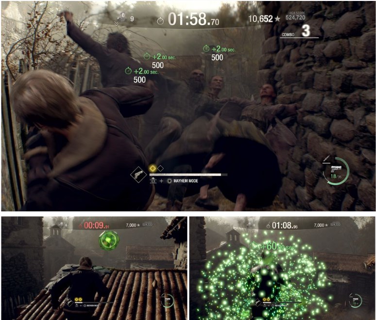 注意到那个黄色菱形图示了吗?这是「混战模式」计量表。当里昂开启「混战模式」时,他的基本能力(例如:攻击力和移动速度)会在一段时间内大幅提高!此外,玩家还会获得额外的分数,每次在「混战模式」中击败一个敌人都会为计时器增加额外的秒数。「混战模式」的计量表会随着时间经过不断累积,此外在击败敌人以及成功抵挡攻击时也会累积。当获得「混战模式宝珠」时,计量槽也会增加一点。