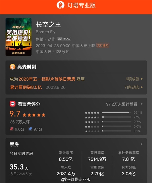 据灯塔专业版,影片《长空之王》8月27日最后一天公映,从4月28日到8月27日,历经121天的飞行”,最终票房8.5亿。