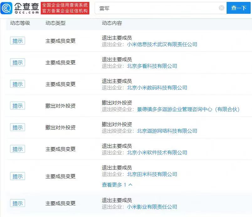 企查查信息显示,小米信息技术武汉公司成立于2018年,注册资本约1.24亿元,由小米香港公司全资持股,经营范围包含信息技术咨询服务;软件开发;货物、技术进出口;自有房屋租赁等。据企查查显示,2023年以来,雷军已退出小米影业、田米科技、北京小米软件、北京多看科技、北京小米数码、迦游网络等多家小米关联公司。