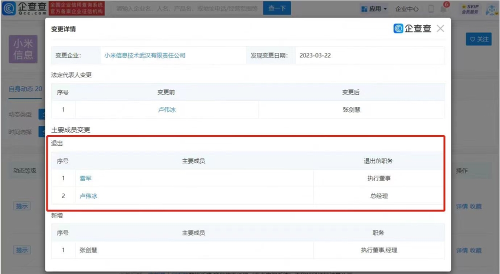 企查查APP显示,近日,小米信息技术武汉有限责任公司发生工商变更,卢伟冰卸任该公司法定代表人、总经理职务,雷军卸任执行董事职务。