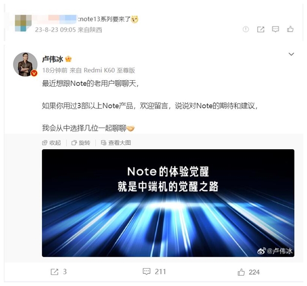 Redmi Note 13系列要来了!卢伟冰微博做调研